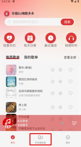 打开车载DJ嗨歌多多app,在主页点击"本地播放器"。