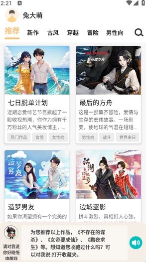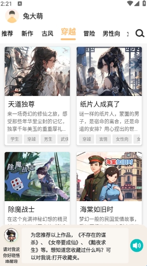 2.涵盖古风、穿越、冒险、言情、男性向、女性向等多种类型,满足不同用户的喜好。