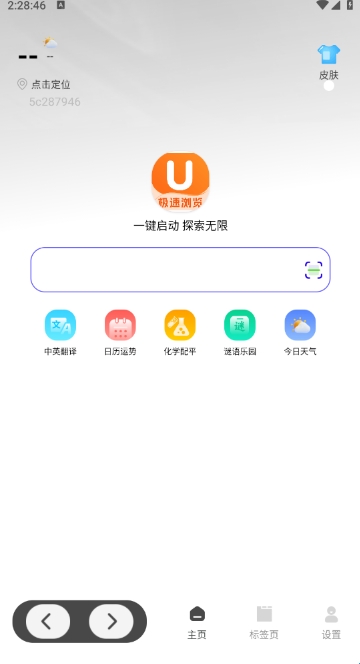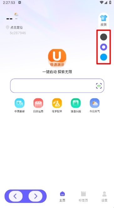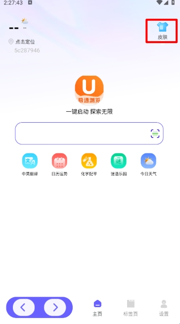 打开UN浏览器app,在主页点击右上角"皮肤"。