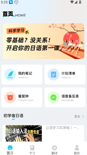 首页有我的笔记、计划清单等功能,还能学习初学者日语。