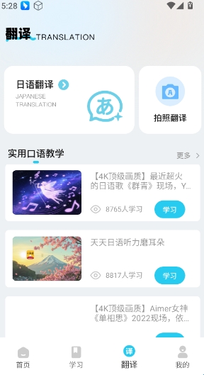 翻译页面可输入文字翻译,也可进行拍照翻译,还有实用日语教学。