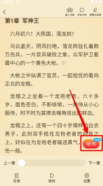 打开在阅读界面点击中间区域呼出菜单,点击"听书"。