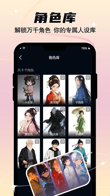 解锁角色库中的万千角色,根据剧情需求选择适配人设(如小女孩、宗门弟子等),无需自行设计角色形象,提升创作效率。