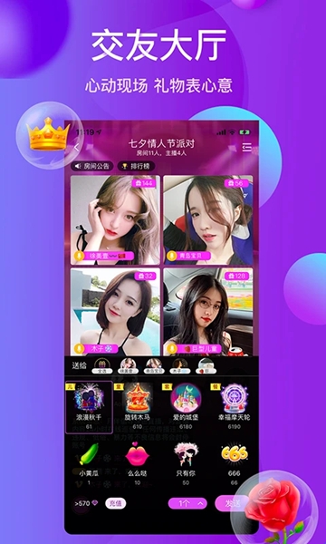 1.多人直播间,4个主播视频位置,5个用户音频位置,让你与主播随时连麦互动;